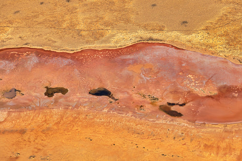 "This series of aerial images explores the stark, abstract beauty of salt lake shorelines—landscapes shaped by wind, water, and mineral sediment. From above, the terrain transforms into flowing patterns and subtle textures, where soft oranges and deep ochres are disrupted by fleeting flashes of aqua or blue—ephemeral signs of water in a parched environment.