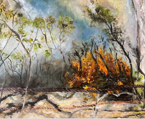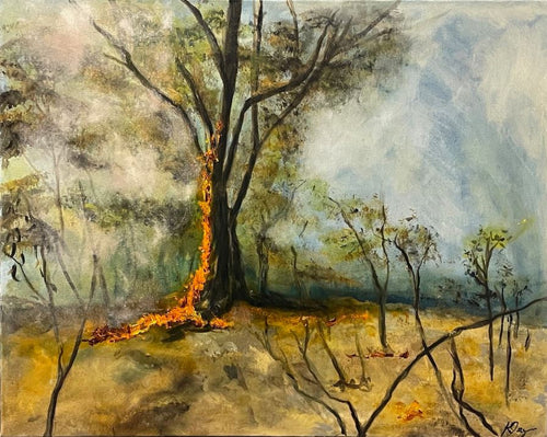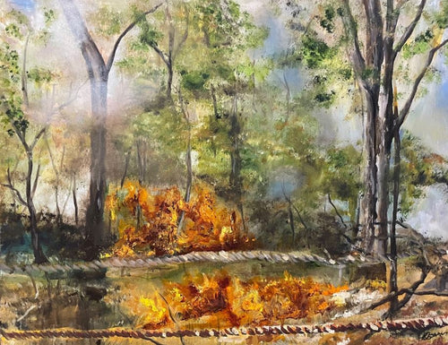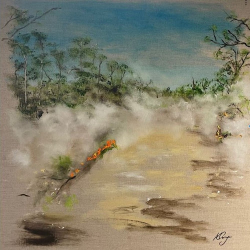 Kristy Osseweyer draws inspiration from the Australian bush, using the motif of fire as both an agent of loss and a force of renewal. Her works reflect the resilience of scorched landscapes and the quiet power of regrowth, echoing the rhythms of nature's recovery.