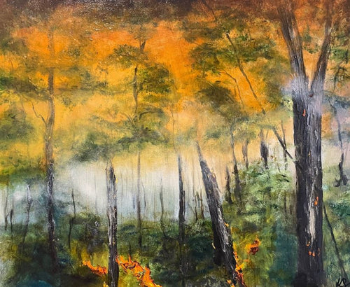 Kristy Osseweyer draws inspiration from the Australian bush, using the motif of fire as both an agent of loss and a force of renewal. Her works reflect the resilience of scorched landscapes and the quiet power of regrowth, echoing the rhythms of nature's recovery.