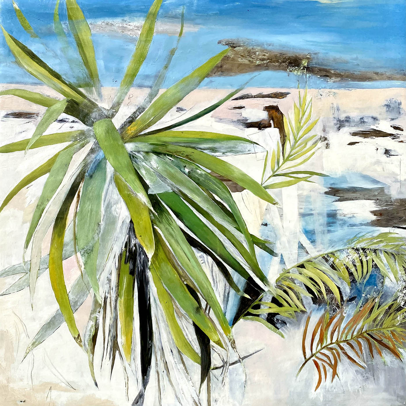 After returning to Queensland, Kaz established her studio in Scarborough on the Redcliffe peninsula. The untamed landscapes surrounding her provide a constant wellspring of inspiration for her semi-abstract paintings. These artworks delve into recognizable organic forms while using abstraction to elicit a profound sense of the universe's vastness and unbridled nature.