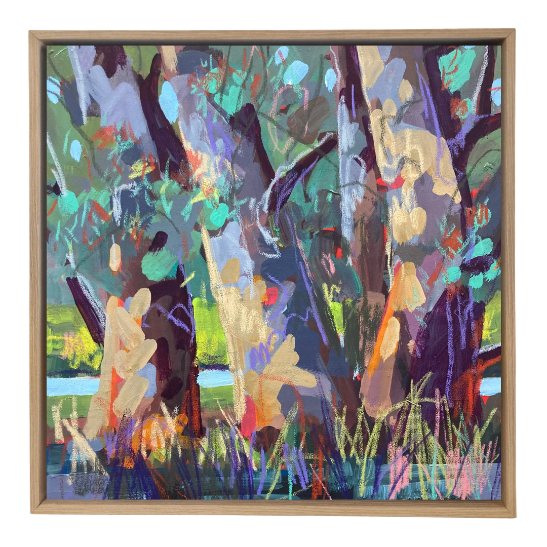 Image 1 displays the framing style for this work and reflects how it has been presented for sale. Flat edged, thin, floater frame in timber.