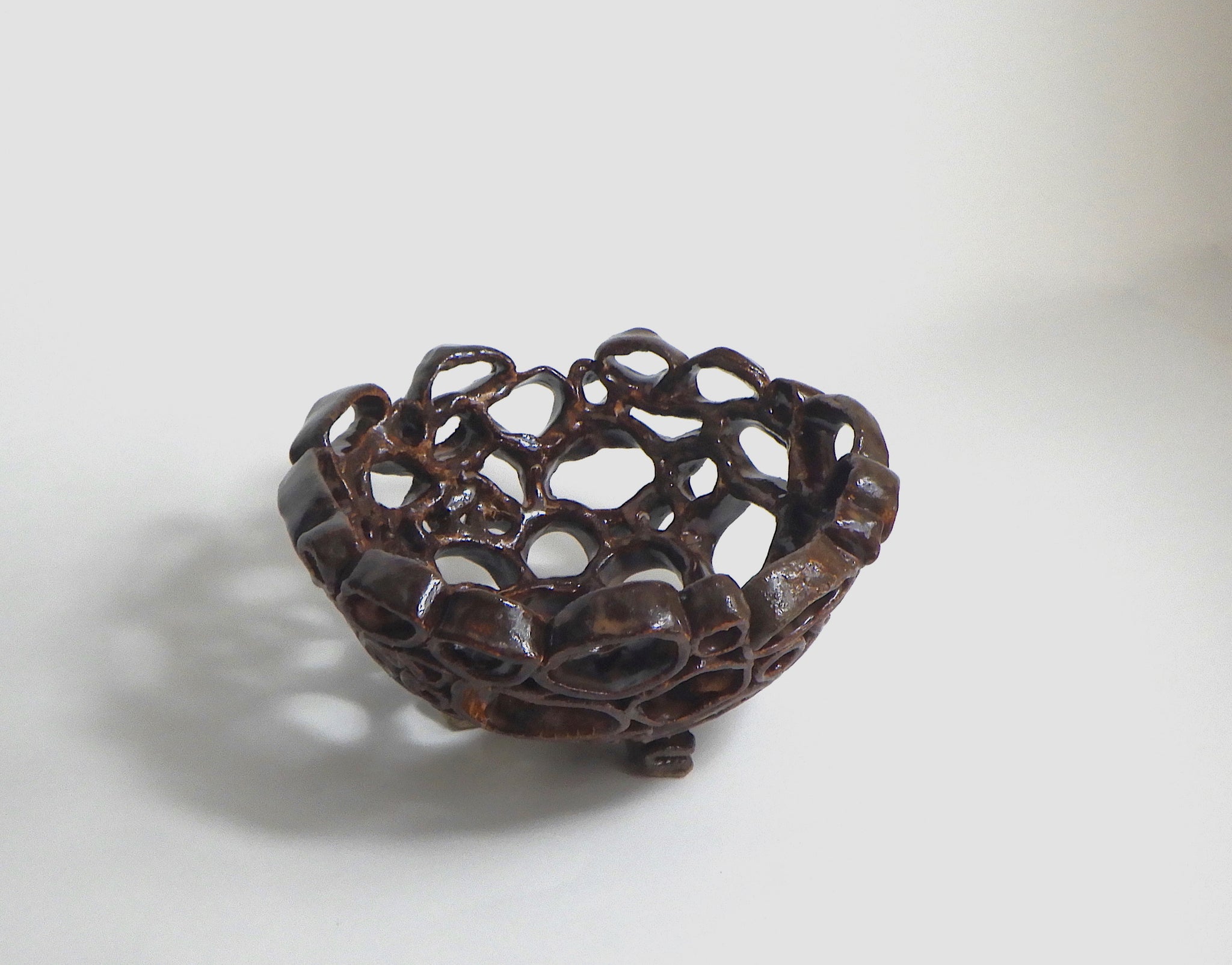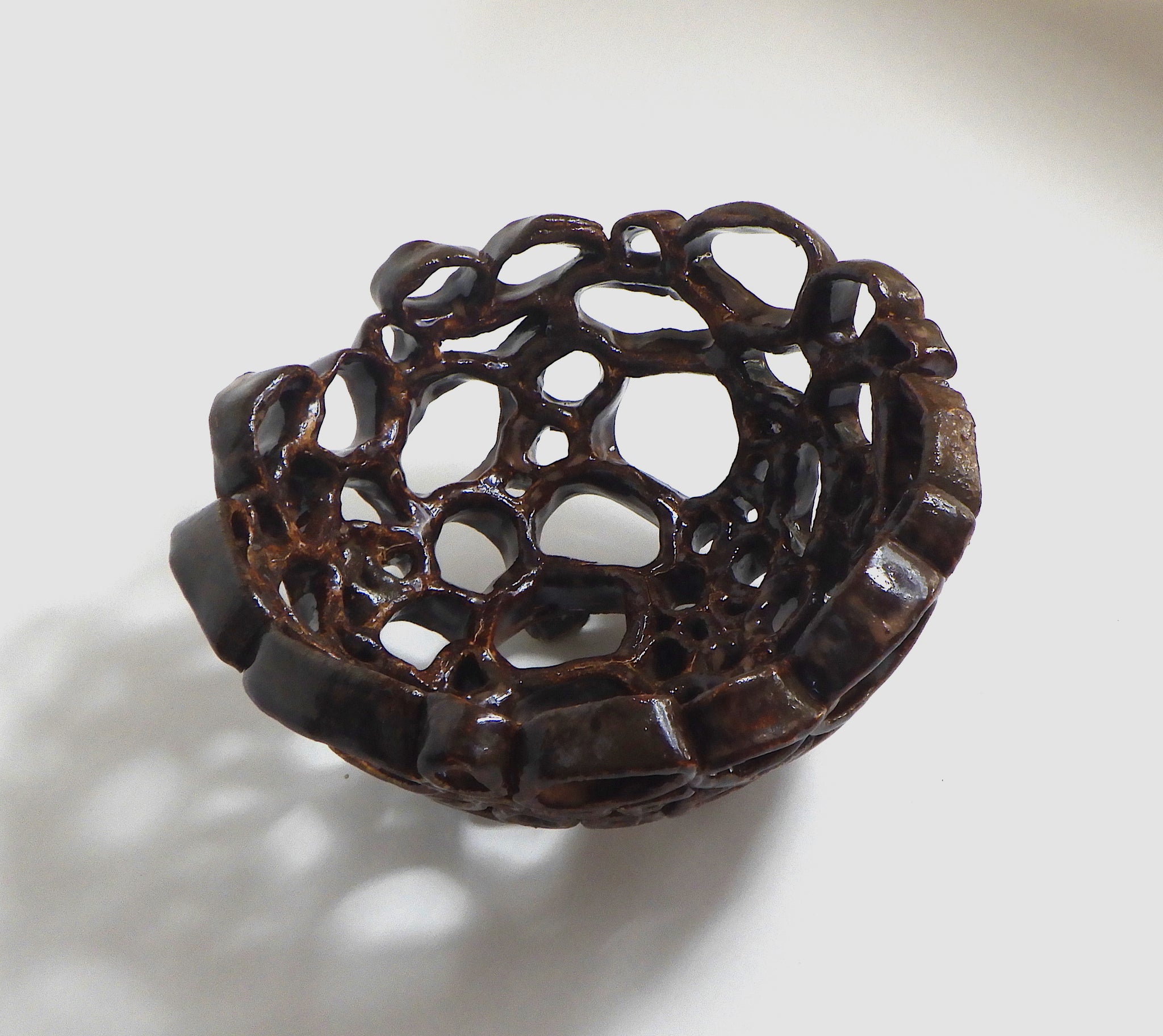 With its open, textured form and striking chocolate glaze, the work invites a closer look — balancing presence and delicacy, structure and air.