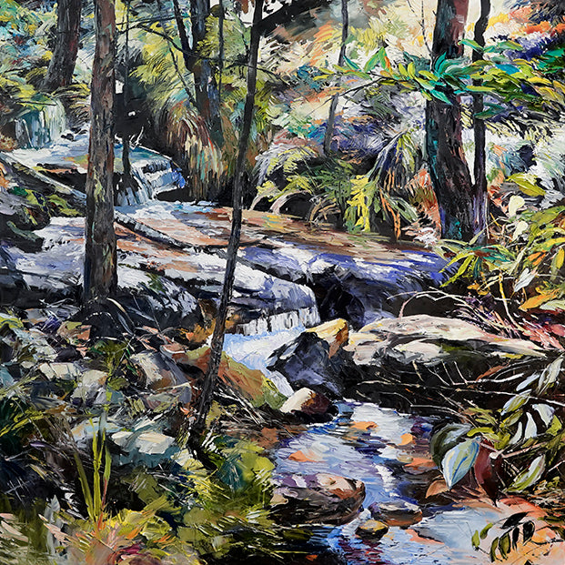 I am currently painting landscapes from around my home. They start as small ‘en plein air' works, then become large studio-completed paintings. I am motivated by the changing weather patterns effecting the area around Mulgoa, on the outskirts of Sydney. After five years of drought and annual fires, the rains came. And it rained for three years! I painted the flowing water and floods that occurred in my backyard, as well as observing the famous falls in the Blue Mountains.