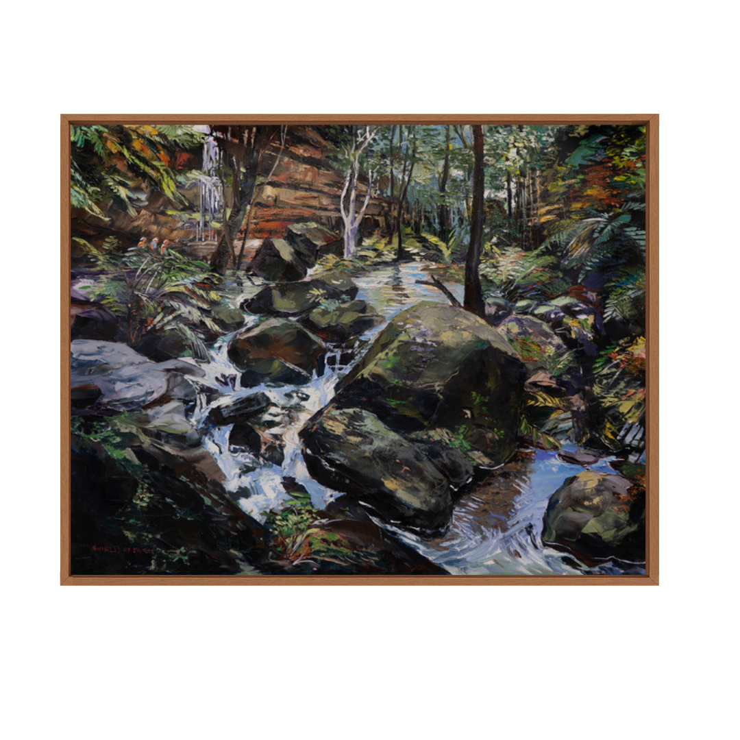The frame pictured in image 1 is indicative of the frame the artist has presented this work in. This is a Tasmanian oak floater frame.