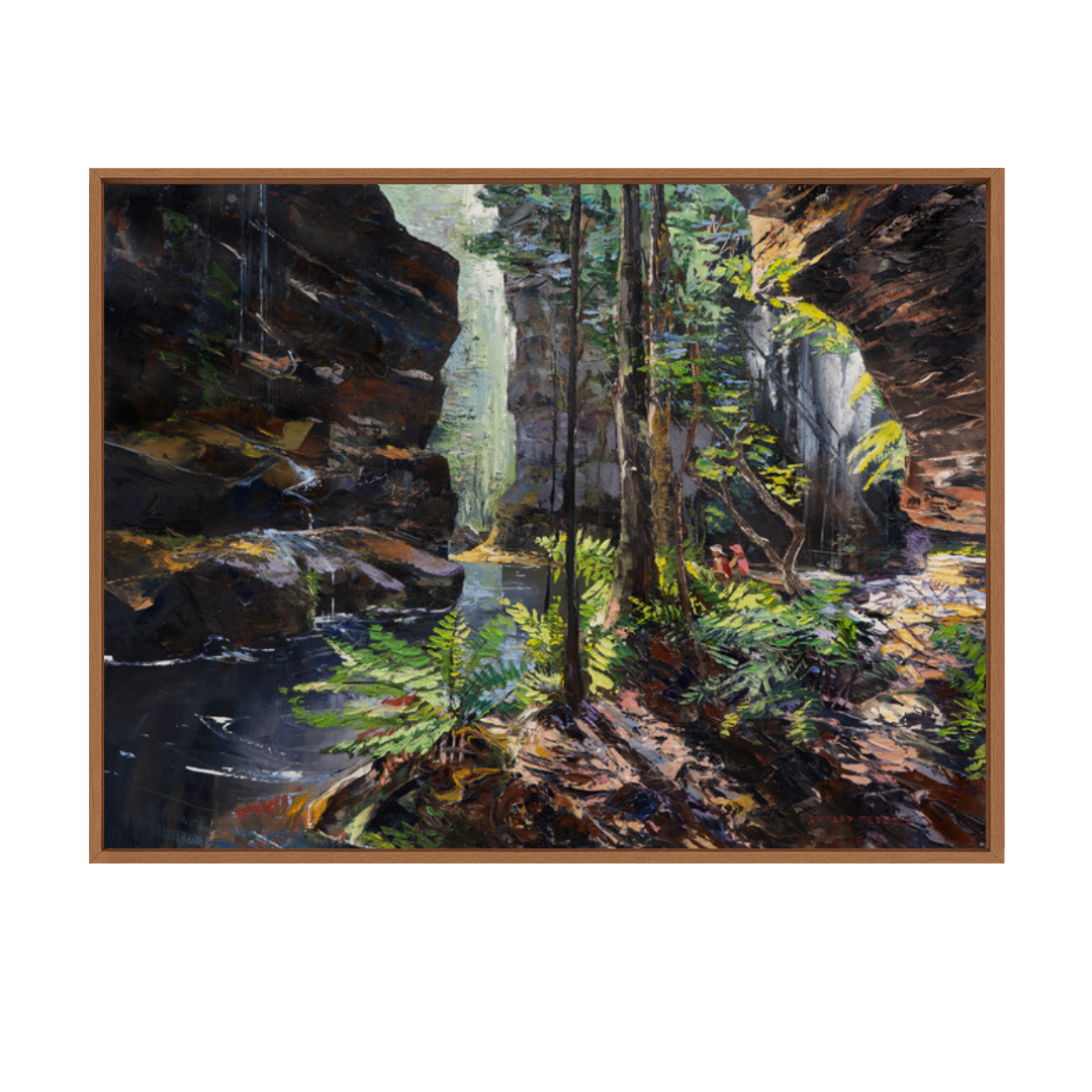 Recently I climbed down the many steps of the Grand Canyon at Blackheath. It was a hot summers day and the roaring sound of rushing water promised a cool experience. The foliage changed from eucalyptus to ferns to moss. Deep within the valley the gently flowing creek, wet ground, ferns and ancient rocks created a timeless world, a glimpse into the past. Despite the modern paving steps that make the walk easy, it felt untouched by humans. Canyon walls towered overhead, sometimes closing in as the path lead through tunnels. Despite a passing storm, the warm summer sunlight filtered through tall tree foliage and the air was cool on my hot day.