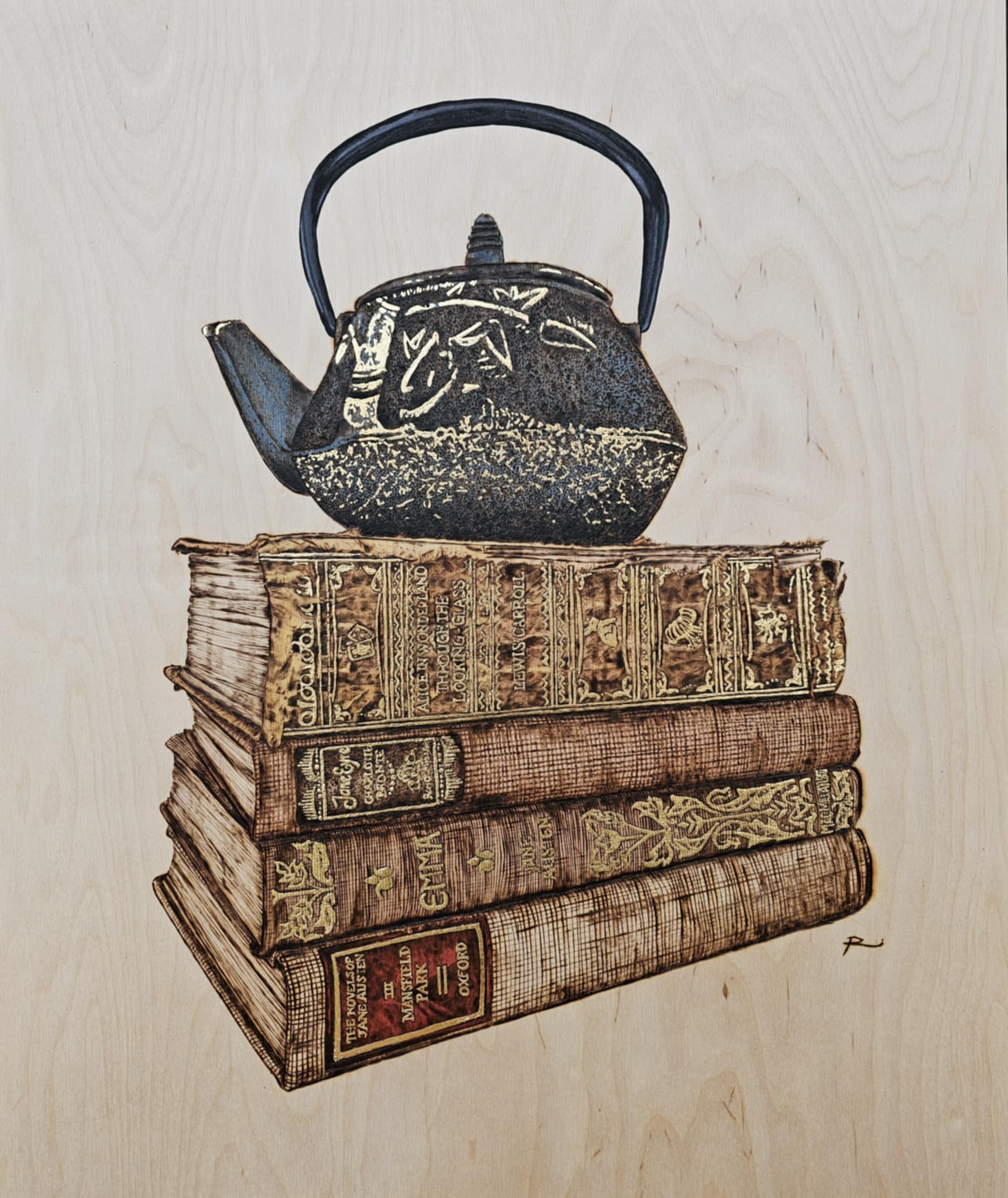 Pyrography & mixed media on board