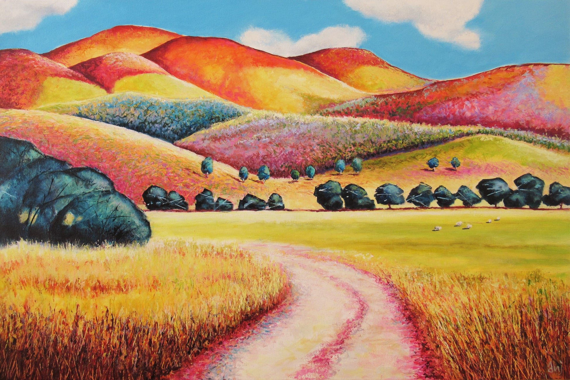 Based in Mudgee, central west NSW, Anjee du Terreau pays homage to the local landscape and environment in terms of bold colour often with a twist of the unexpected. Her work is usually initiated by a photo taken on trips around the local backroads and which provides a springboard for letting her imagination take flight, creating the living essence of the subject whilst still referencing its reality.