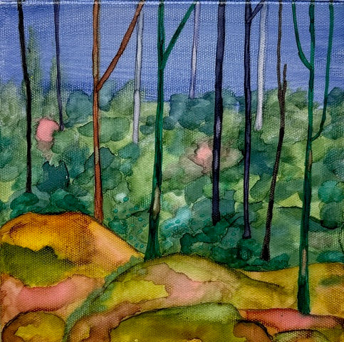 Created in flowing inks and polymers and punctuated with textural gestures, veils of flowing semi-transparent glazes and pigments develop an ethereal, luminous finish of each artwork. Ultra-smooth polypropylene and canvases provide the supports for her expressionist art, narrating her responses to the natural world which surrounds her Blue Mountains Studio on the edge of the World Heritage Listed National Park.