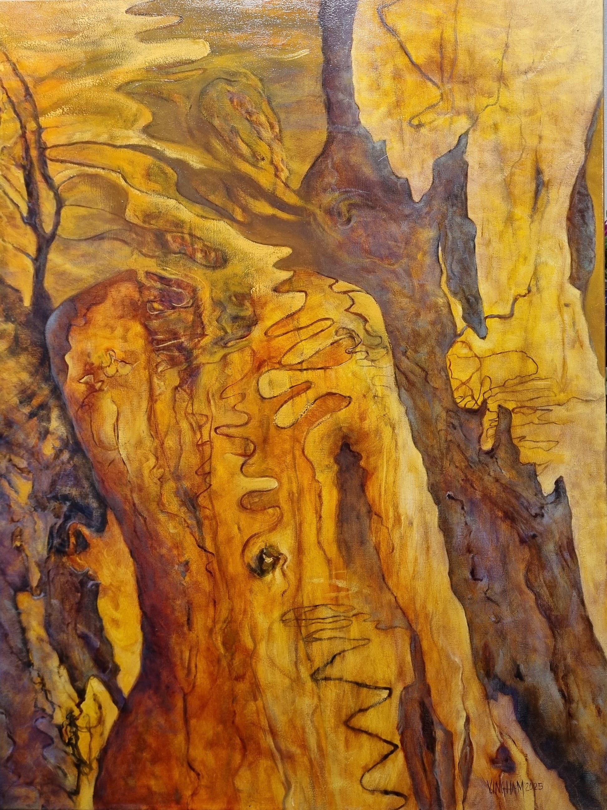 I am inspired by the luminous colours of eucalypt trunks and the endless scribbles of the moth larvae Ogmograptis scribula. I endeavour to retain the essence of the gnarled bark and exquisitely patterned scribbles in my figures.