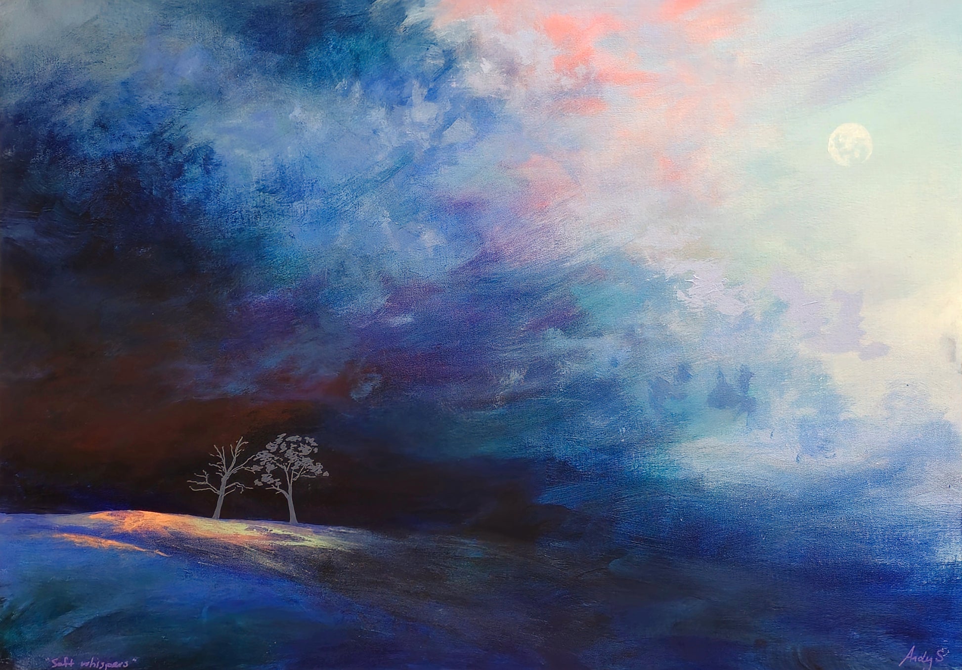 Not content with merely capturing landscapes, he soon became captivated by the idea of expressing emotions and ideas through his painting. He incorporates semi-abstract elements and unusually evocative and emotive colour choices, conveying a sense of mystery and wonder to the viewer.