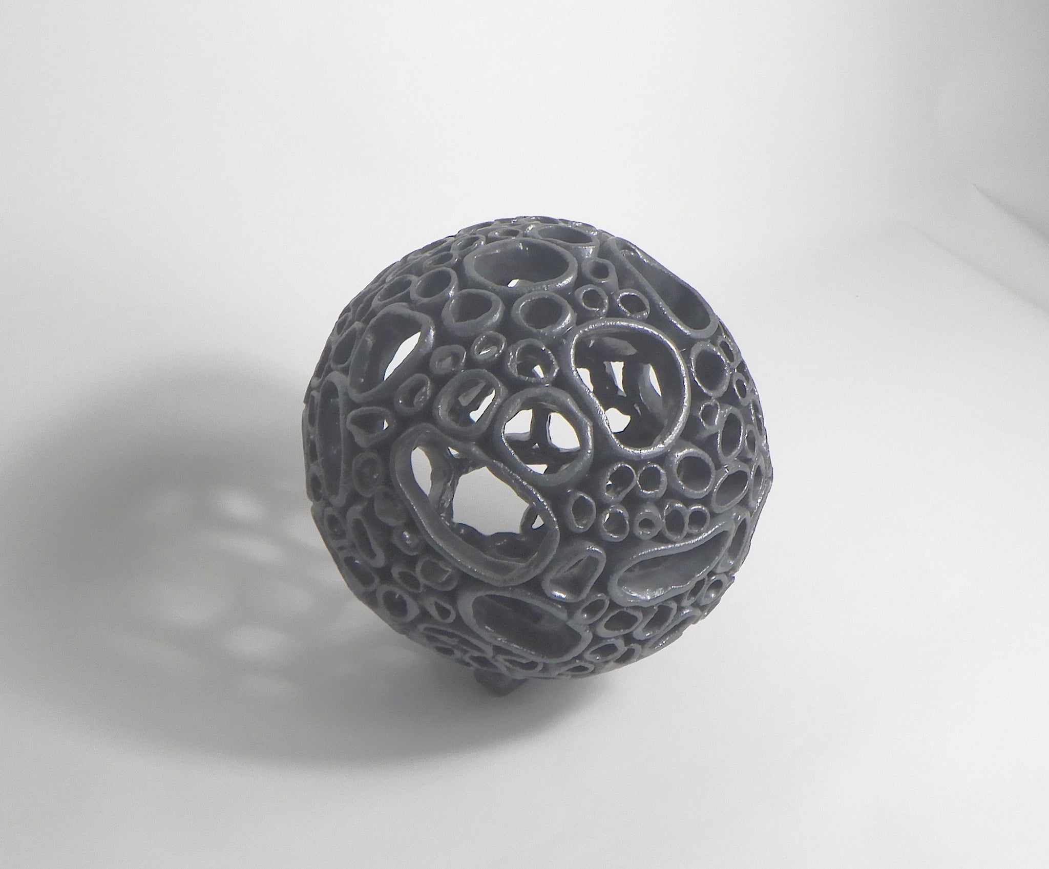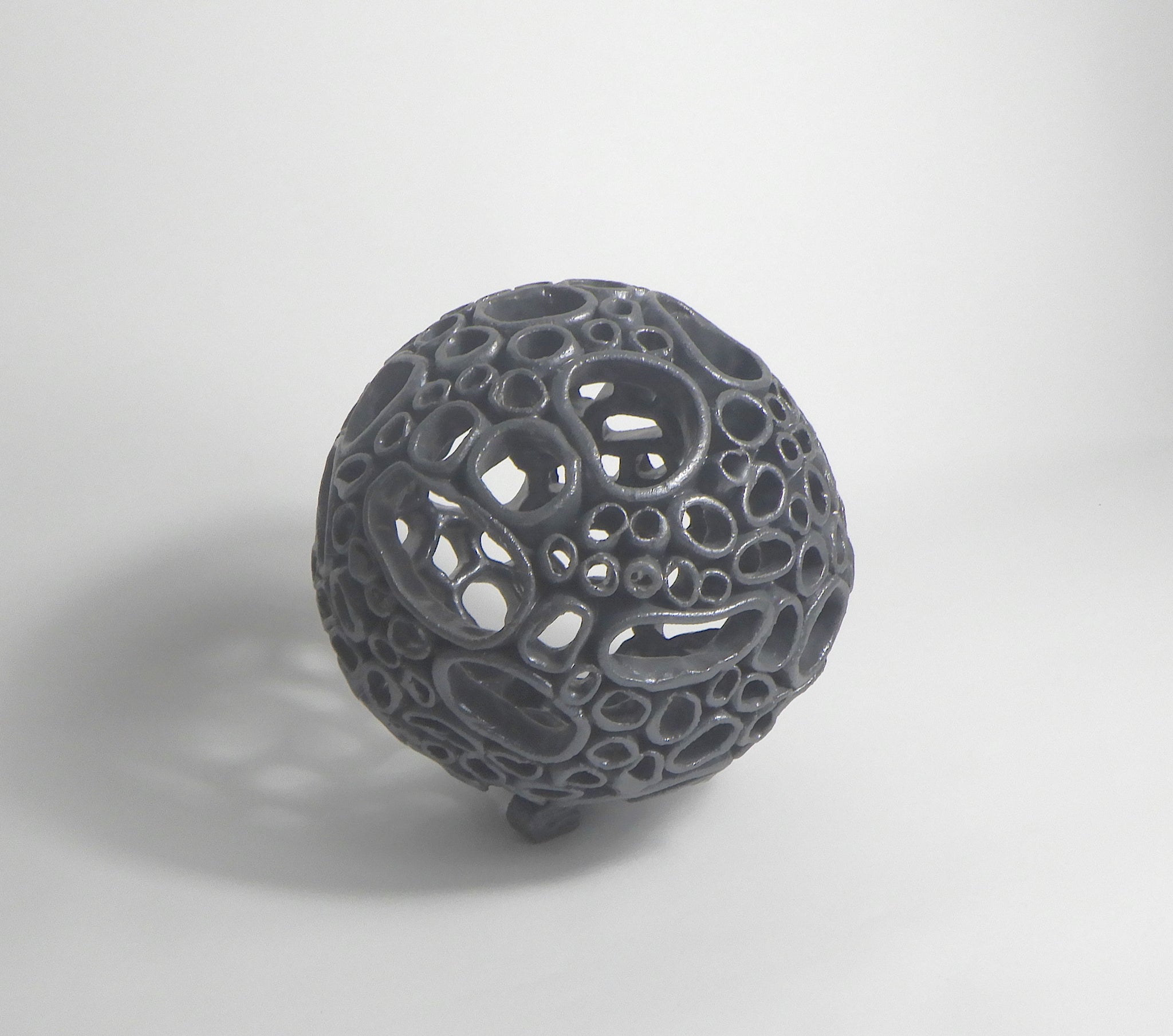 This hand built ceramic sculpture takes form as a hollow, spherical lattice of interwoven openings, evoking the porous structures shaped by nature where water and air continually move through. Its clustered, organic apertures recall tidal pools, coral colonies, or eroded rock faces, places where life gathers and shifts with each change of tide. These works aim to capture the essence of natural cycles—how the ocean shapes stone, how voids become vessels, and how absence can hold as much presence as form.