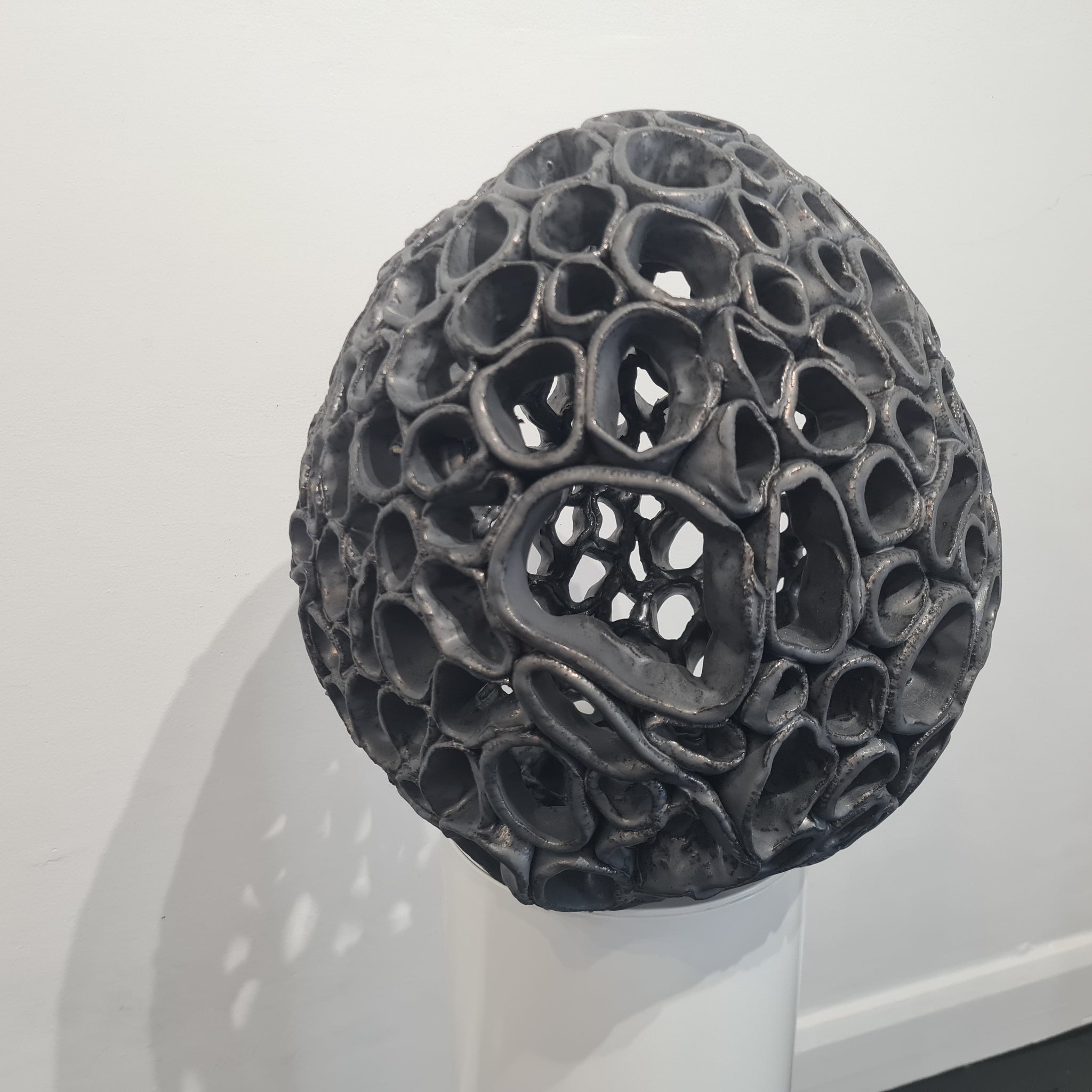 This hand built ceramic sculpture takes form as a hollow, spherical lattice of interwoven openings, evoking the porous structures shaped by nature where water and air continually move through. Its clustered, organic apertures recall tidal pools, coral colonies, or eroded rock faces, places where life gathers and shifts with each change of tide. These works aim to capture the essence of natural cycles—how the ocean shapes stone, how voids become vessels, and how absence can hold as much presence as form.