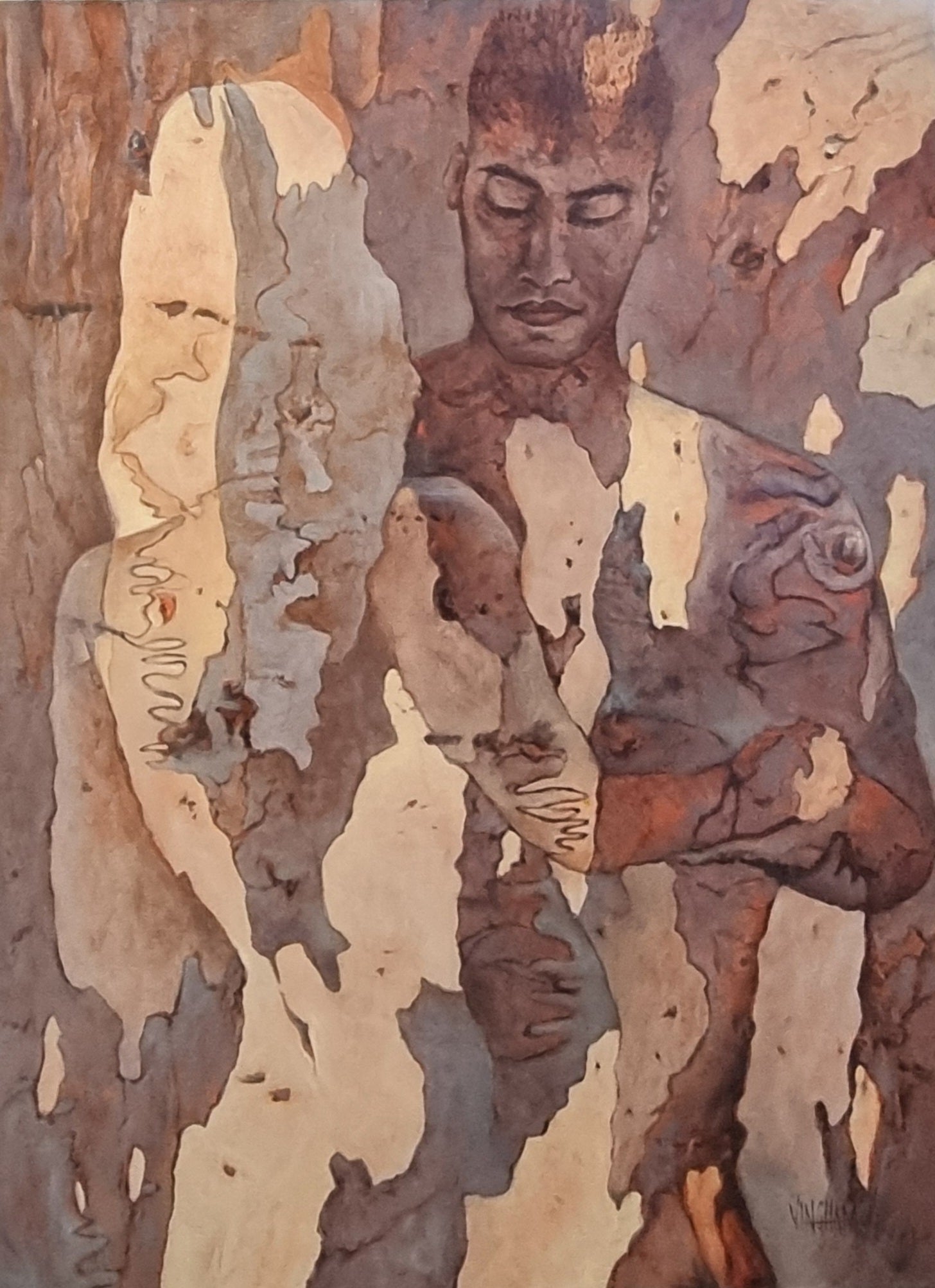 I am inspired by the luminous colours of eucalypt trunks and the endless scribbles of the moth larvae Ogmograptis scribula. I endeavour to retain the essence of the gnarled bark and exquisitely patterned scribbles in my figures.