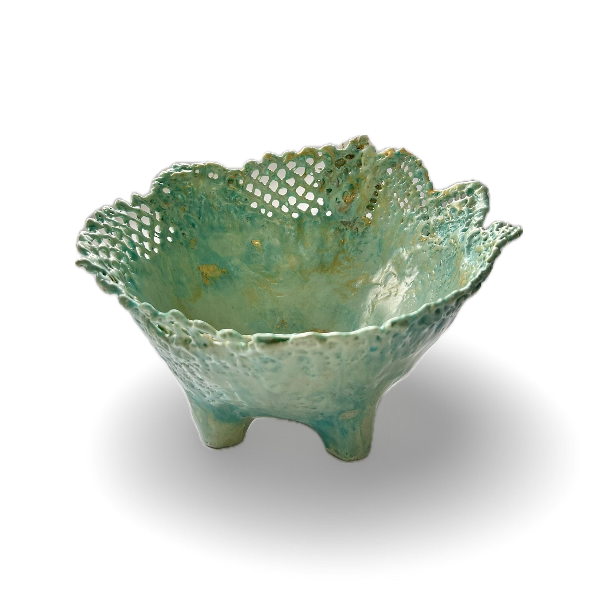 The Nurturer, The Guardian, and The Mender form a quiet trilogy of feminine archetypes expressed through vessel-like forms. Integrating repurposed hand-tatted doilies within layers of encaustic, each sculpture transforms symbols of traditional care into structures of strength and resilience. Open, elevated, or inwardly held, the works speak to acts of holding, protecting and restoring, gestures of labour often unseen yet foundational. Together they honour the enduring, adaptive force of women as keepers, defenders and healers across home, work and community.