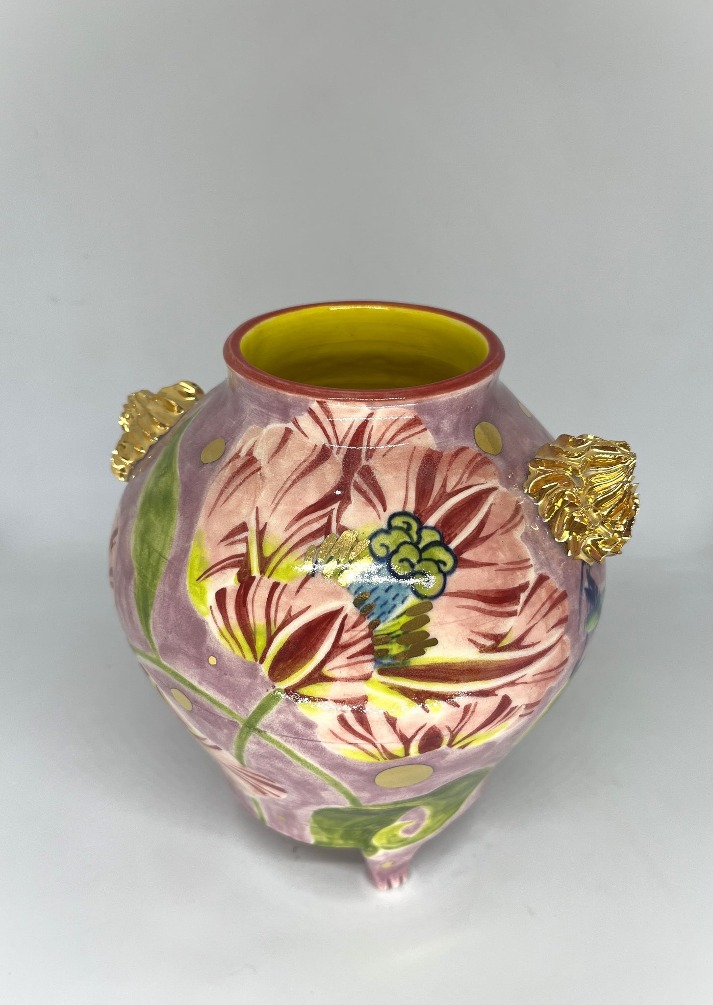 Underglazes on white, wheel thrown earthenware with applied legs and decoration. Clear glaze. Gold lustre. Signed.